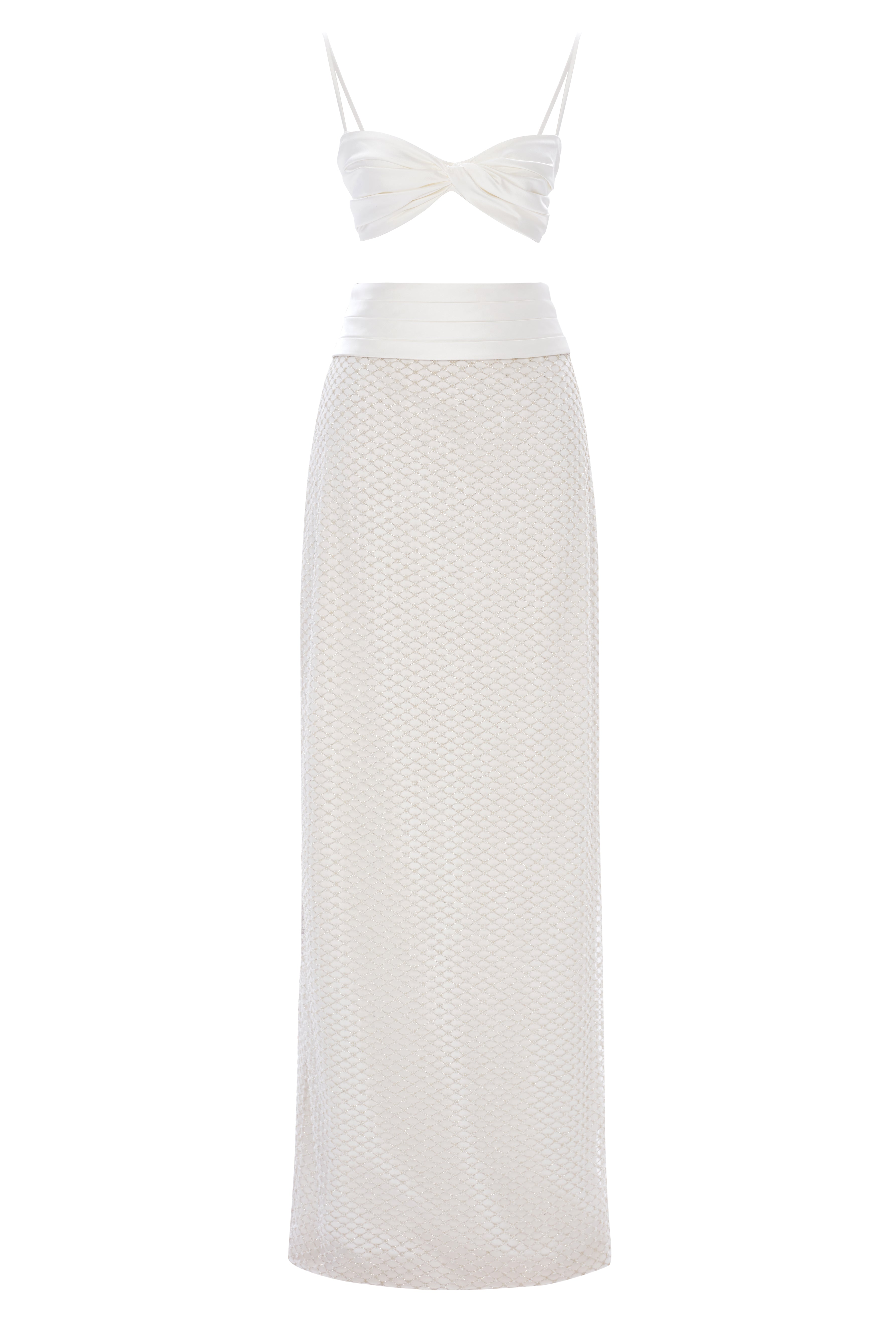 Introducing the exquisite LENA from @begumbdh, a stunning two-piece ensemble designed to make a sophisticated statement. The top, crafted from luxurious satin, features a flattering twist front design with delicate spaghetti straps, exuding elegance and femininity.