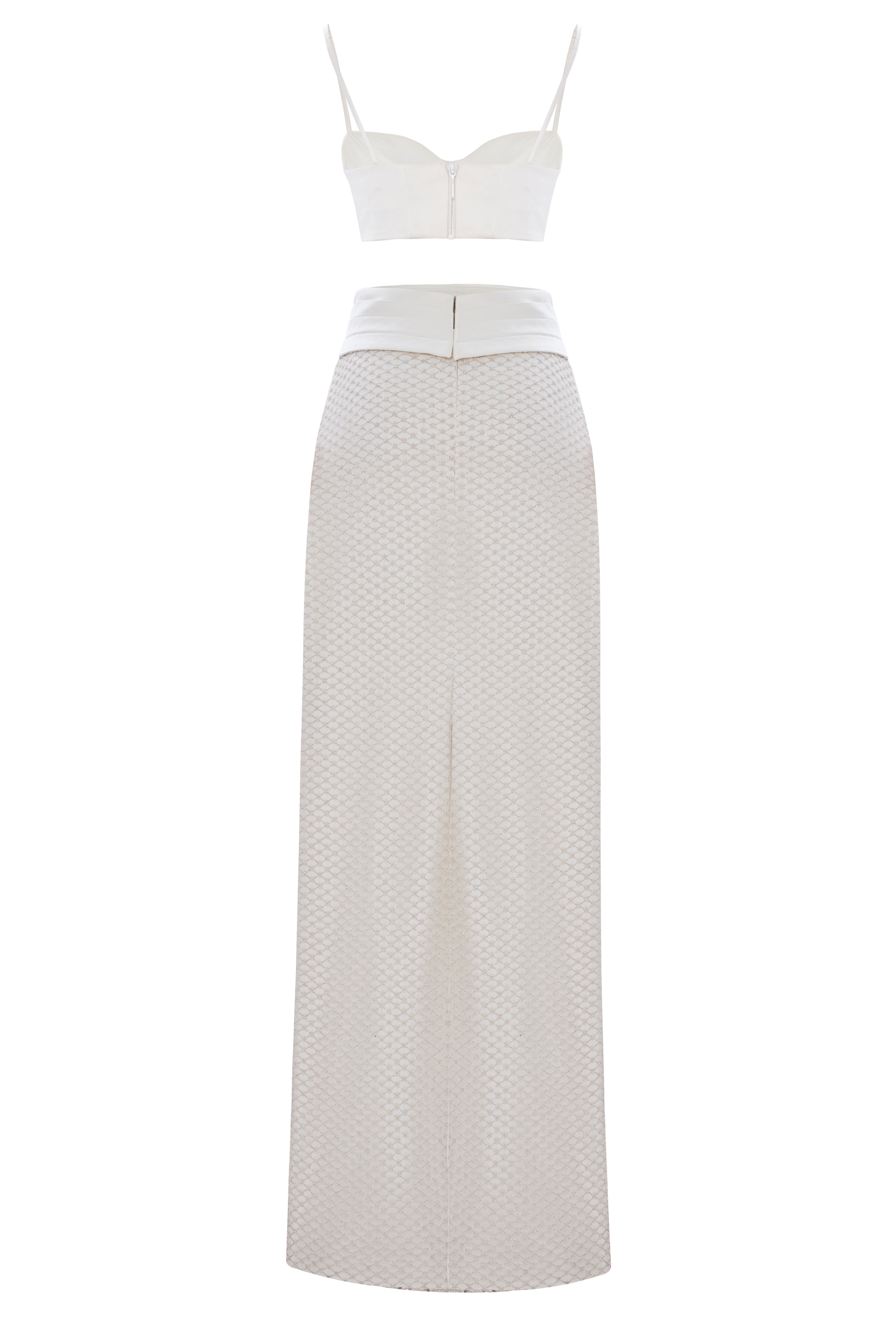 Paired perfectly with the top, the skirt showcases a satin tuxedo belt that cinches at the waist, enhancing your silhouette. The skirt is adorned with pearl and glitter tulle, creating a mesmerizing texture and a subtle shimmer that catches the light beautifully.