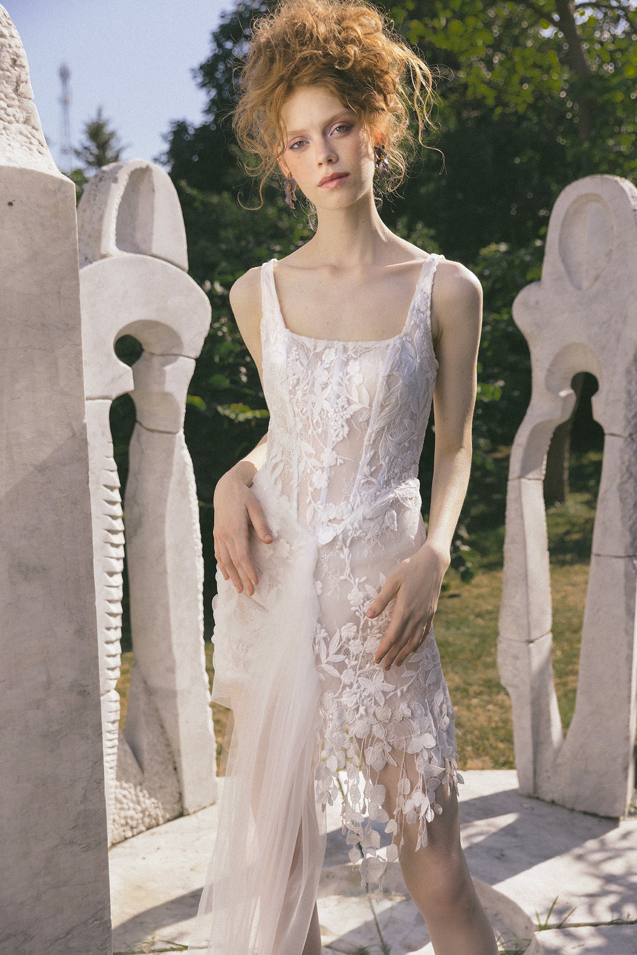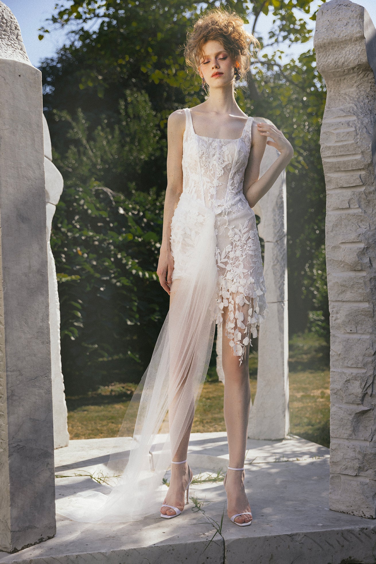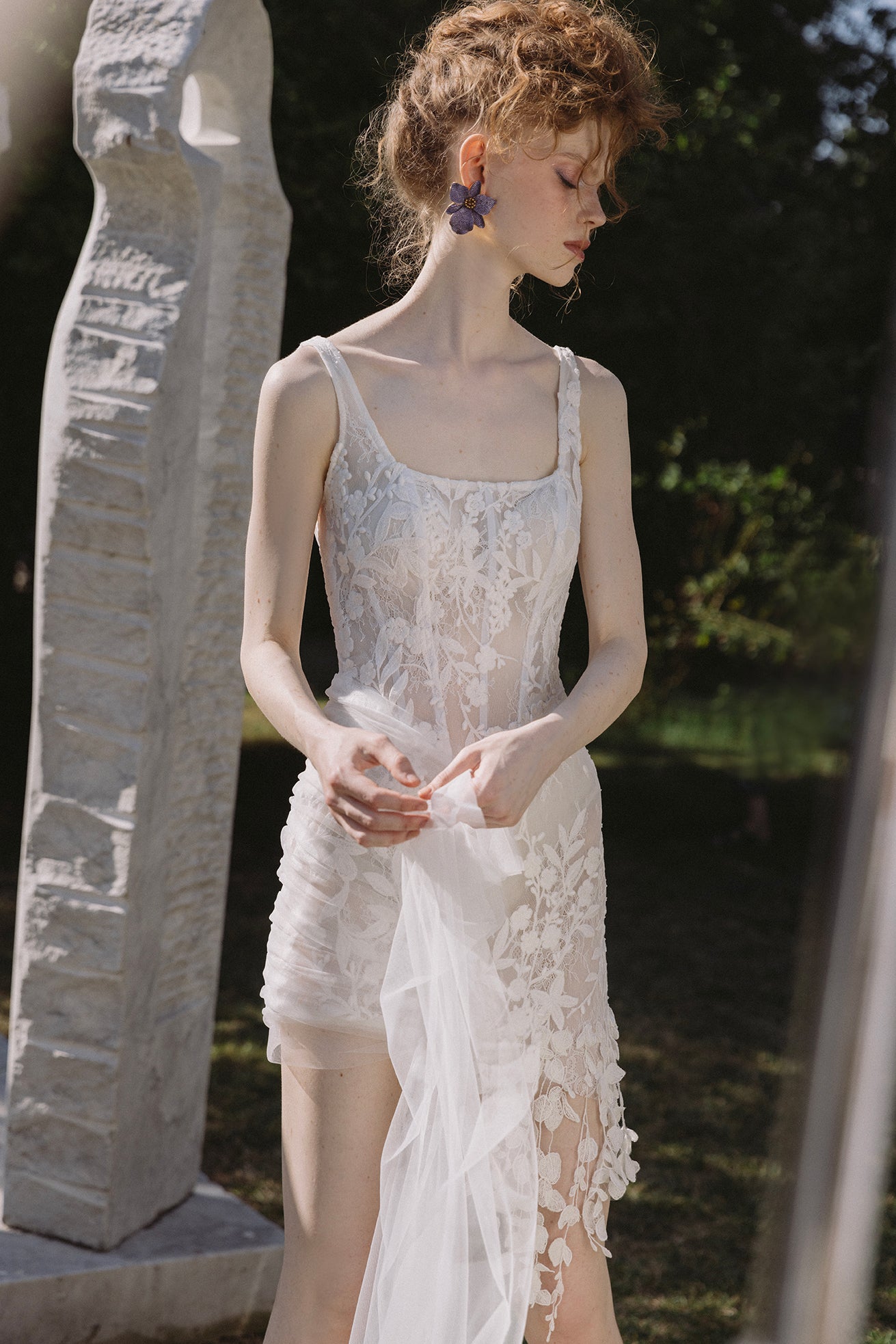A square-neck, corseted mini dress featuring floral embroidery over lace, with 3D floral appliqués along the hem and a draped silk tulle detail at the front.